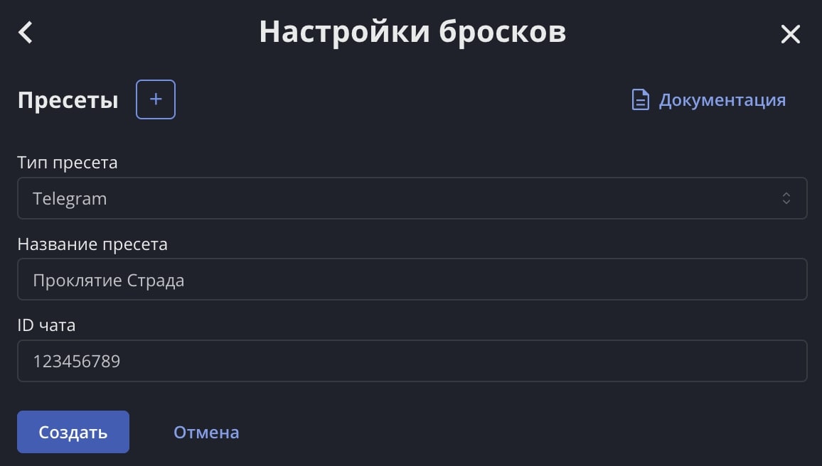 Нажмите на + и в появившейся форме выберите тип пресета «Telegram». Заполните все поля.