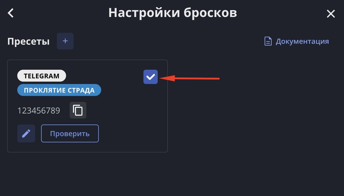 У созданного пресета имеется кнопка «Проверить», с помощью которой можно отправить тестовое сообщение в Telegram.