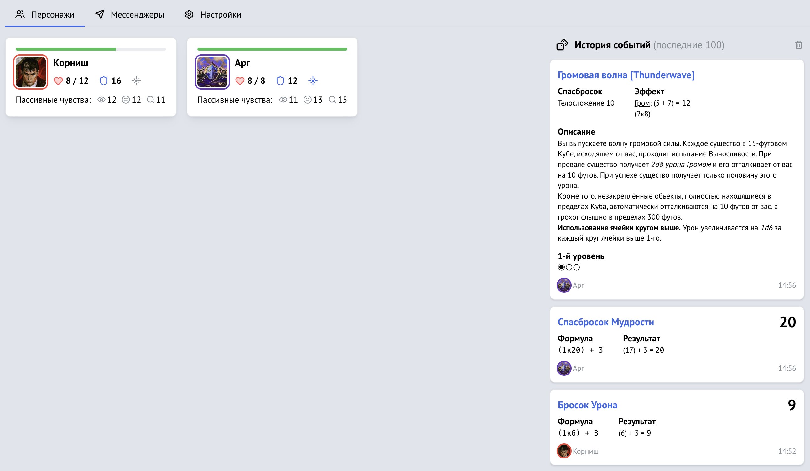 - Ведёт историю событий — все броски из листов персонажей и сотворение заклинаний появляются в общем журнале мгновенно.